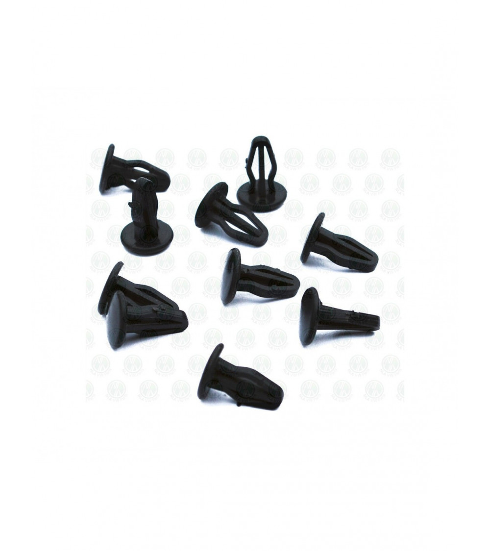 Wysokiej jakości reprodukcja klipsów do paneli wewnętrznych Westfalia, 10 sztuk w opakowaniu, zgodnie z oryginałem. Wykonane są z czarnego tworzywa ABS.